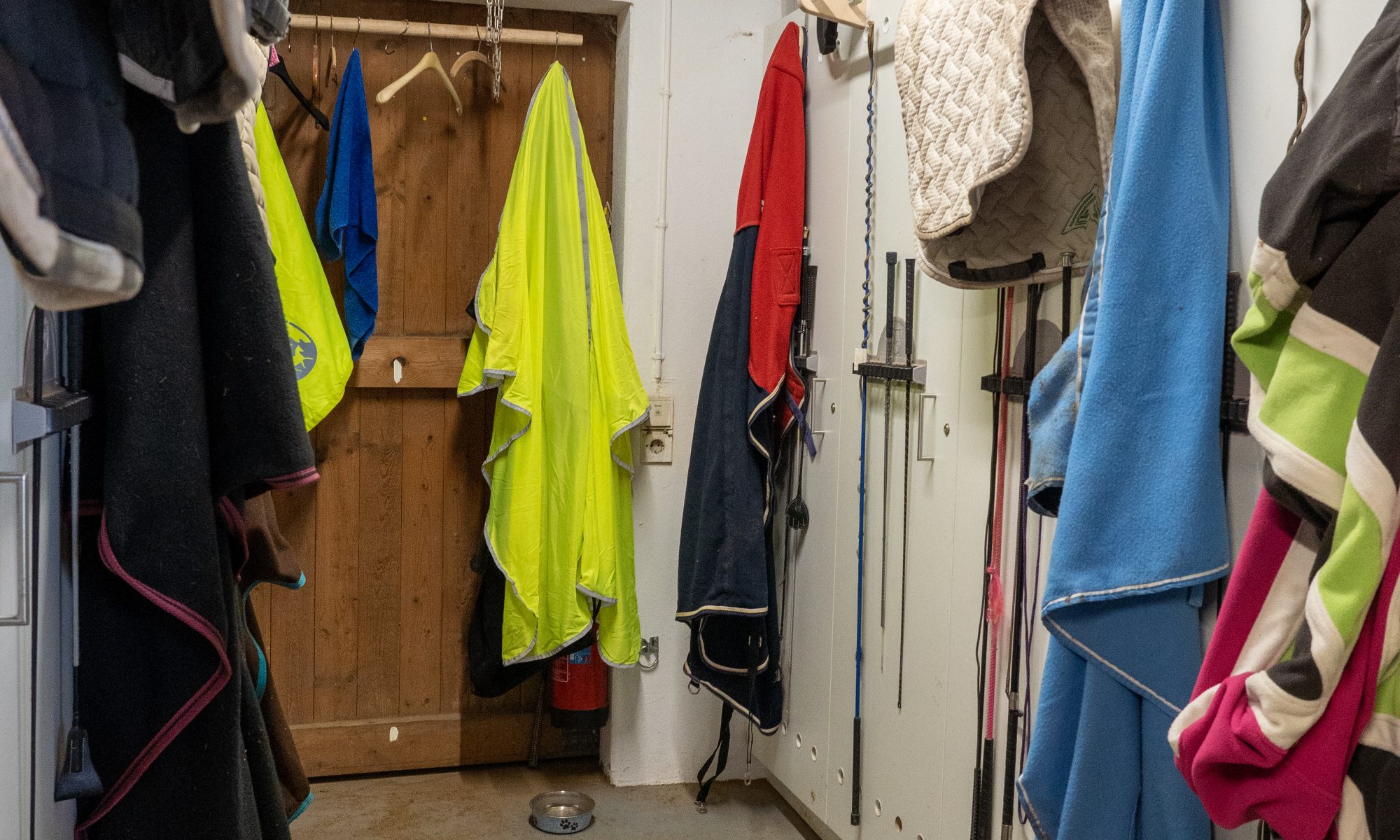 Jedem Pferd steht ein geräumiger Schrank mit zwei Sattelhaltern zur Verfügung. Außerdem gibt es ein Waschbecken mit warmem Wasser. An den Schränken gibt es genug Platz zum Trocknen von Schabracken und Decken.